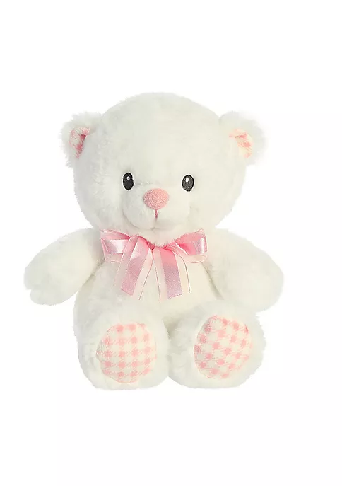 A great introduction to any newborn’s plush collection, Cotton Bear in pink is made with super soft and cuddly fur, which is gentle on the skin. This white teddy has a bright smile, pink ribbon bow on its neck, and pink and white checkered feet pads and ears.12 inches in size.High quality materials make for a soft and fluffy touchQuality materials for a soft cuddling experienceCute face that will steal your heartPerfect gift for newborns