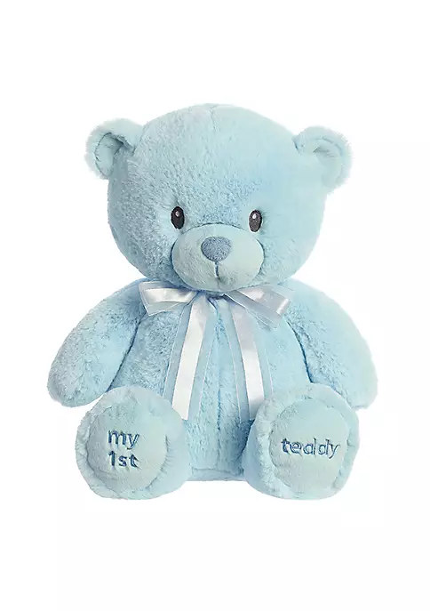 A great introduction to any newborn’s plush collection. My First Teddy in blue is made with super soft and cuddly fur which is gentle on the skin. This teddy has a blue ribbon with “my 1st” embroidered on the right foot and “teddy” on the left foot.18 inches long from top to bottomHigh Quality materials for a soft cuddling experienceHigh Quality materials for a soft cuddling experienceCute face that will steal your heartSuitable for all ages